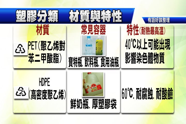 40度,二號 清潔劑瓶、3 號塑膠杯、4號塑膠袋,耐熱都只有 60度、5號是微波容器耐熱可以到135度、6是泡麵碗